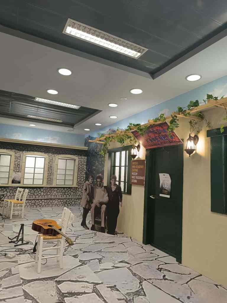 Ρίγη συγκίνησης σκορπά το περίπτερο-αφιέρωμα στον σπουδαίο Μίκη Θεοδωράκη. Αυτό γιατί δημιουργήθηκε ένας πολύ όμορφος καφενειακός χώρος, που απεικονίζει το χωριό του αείμνηστου μουσικοσυνθέτη, Ζάτουνα Γορτυνίας.