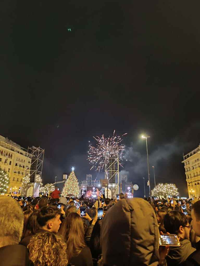 Στις 20:00 η παρουσιάστρια της βραδιάς, Μαρία Μπεκατώρου, καλωσόρισε, με τη ζεστή φωνή της, όλους τους παρευρισκόμενους και τη σκυτάλη πήρε η Φιλαρμονική Ορχήστρα του Δήμου Θεσσαλονίκης και ακολούθησε ένα αρκετά ξεσηκωτικό πρόγραμμα του συγκροτήματος «Wedding Singers». Η προσέλευση του κόσμου όλο και αυξανόταν και, λίγο μετά τις 21:00, ανέβηκε στη σκηνή ο δήμαρχος της πόλης, Στέλιος Αγγελούδης, ώστε να δώσει το σύνθημα και να ανάψουν τα εκατοντάδες λαμπιόνια του Χριστουγεννιάτικου δέντρου, ύψους 18 μέτρων. «Βρέχει χαμόγελα, αισιοδοξία και χαμόγελα», είπε ο δήμαρχος της πόλης, το δέντρο άναψε και ο ουρανός, για μερικά λεπτά, γέμισε πυροτεχνήματα.